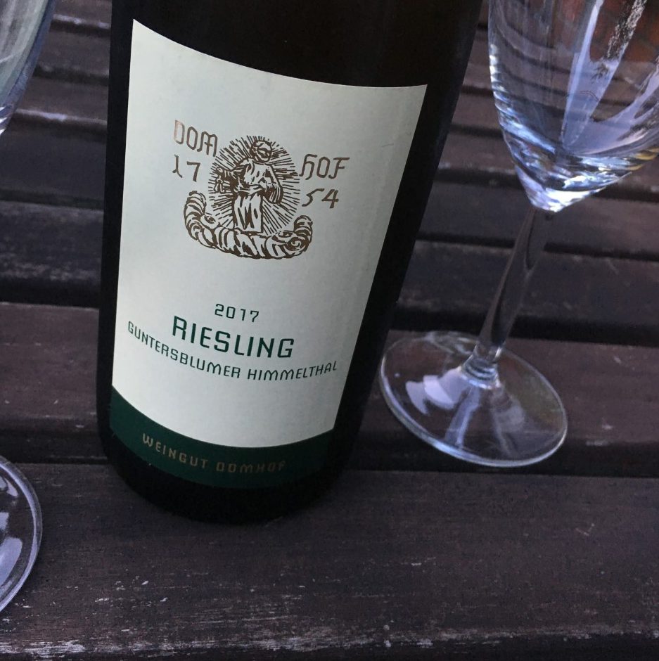 Wir lauschen in uns und den lauen Sommerabend hinein und wählen einen Riesling aus: Der Guntersblumer Himmelthal Jahrgang 2017. Dieser Wein hat auf verschlungenen Wegen zu uns gefunden. Ein Freund von Siegfried hatte sich arbeitsbedingt in das illustre Guntersblum begeben und dort auf Siegfrieds Wunsch hin beim Weingut Domhof vorbeigeschaut. Dort war Siegfrieds Name ein Begriff und drei vielversprechende Flaschen wechselten für einen fast symbolisch zu nennenden Betrag die Hände.